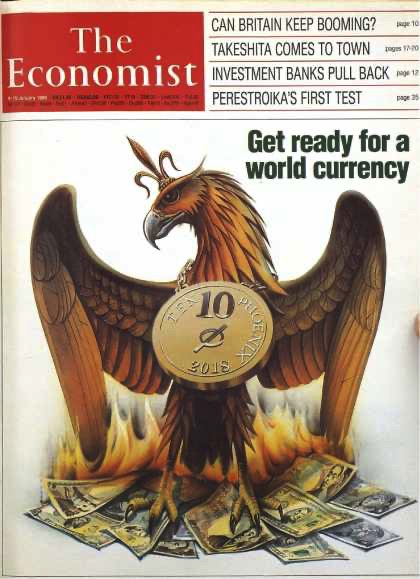 In 1988 the Economist magazine issued and article “Get ready for a new World Currency 2018." The Economist magazine is published by the Economist Group, 50% owned by the Rothschild family, first published in 1843. It is printed in the City of London being the Financial Capital of Western Banking. The Elite always disclose their plans to see what the reaction will be and this was accomplished 30 yrs ago. The illustration shows the paper U.S. dollars burning and a new Phoenix coin around the Eagles neck with the year 2018.